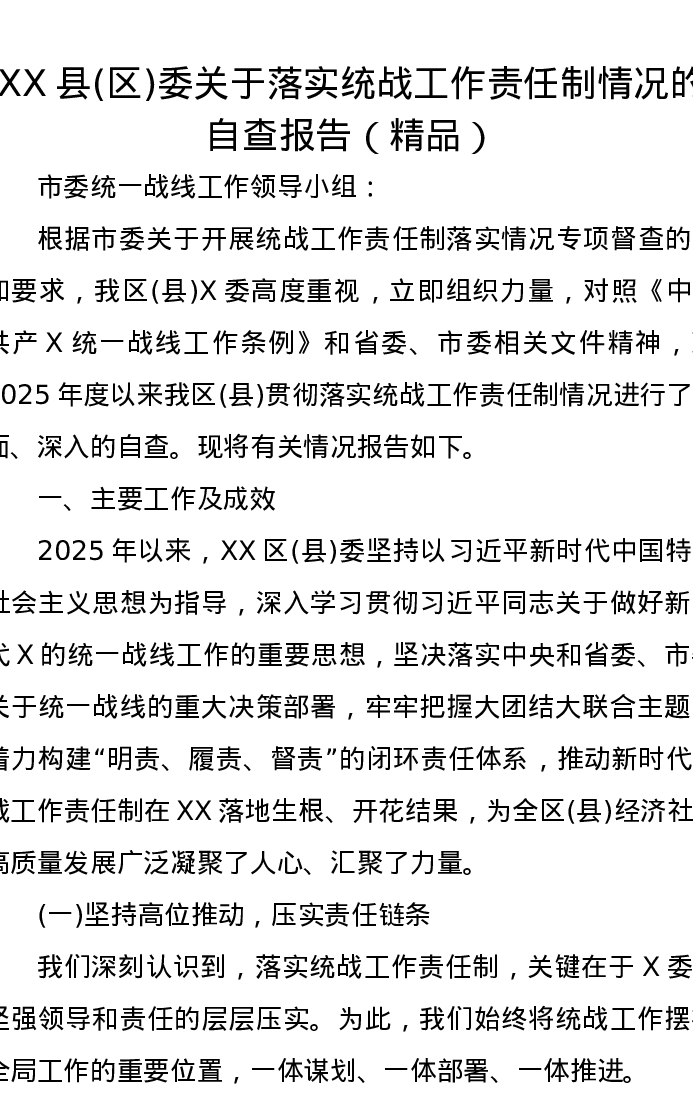 XX县(区)委关于落实统战工作责任制情况的自查报告(精品)