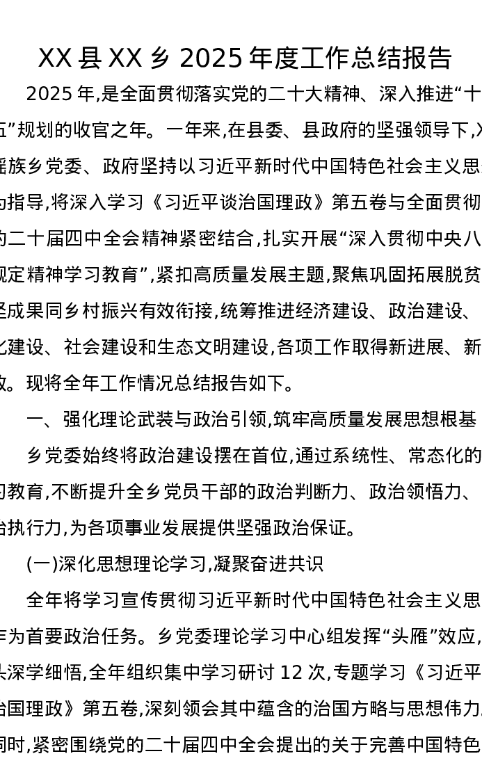 XX县XX乡2025年度工作总结报告
