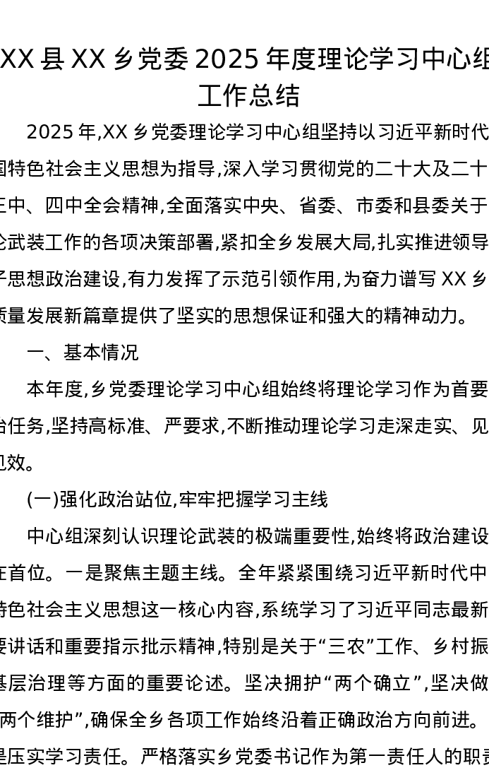 XX县XX乡党委2025年度理论学习中心组工作总结