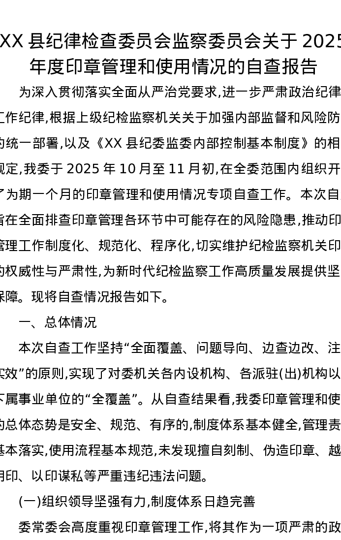 XX县纪律检查委员会监察委员会关于2025年度印章管理和使用情况的自查报告