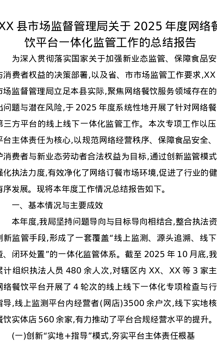 XX县市场监督管理局关于2025年度网络餐饮平台一体化监管工作的总结报告