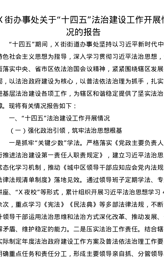 X街办事处关于“十四五”法治建设工作开展情况的报告