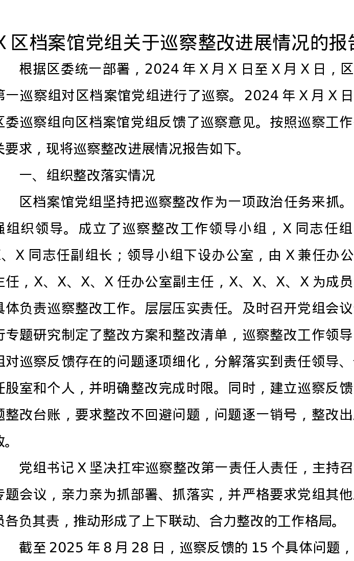 X区档案馆党组关于巡察整改进展情况的报告