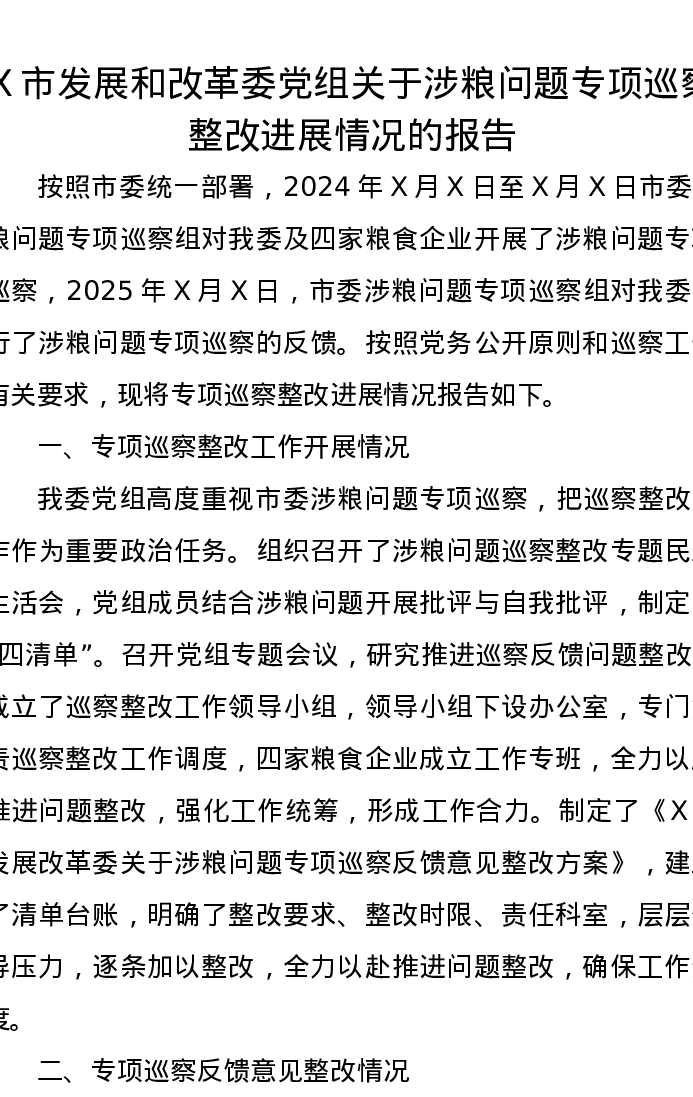 X市发展和改革委党组关于涉粮问题专项巡察整改进展情况的报告