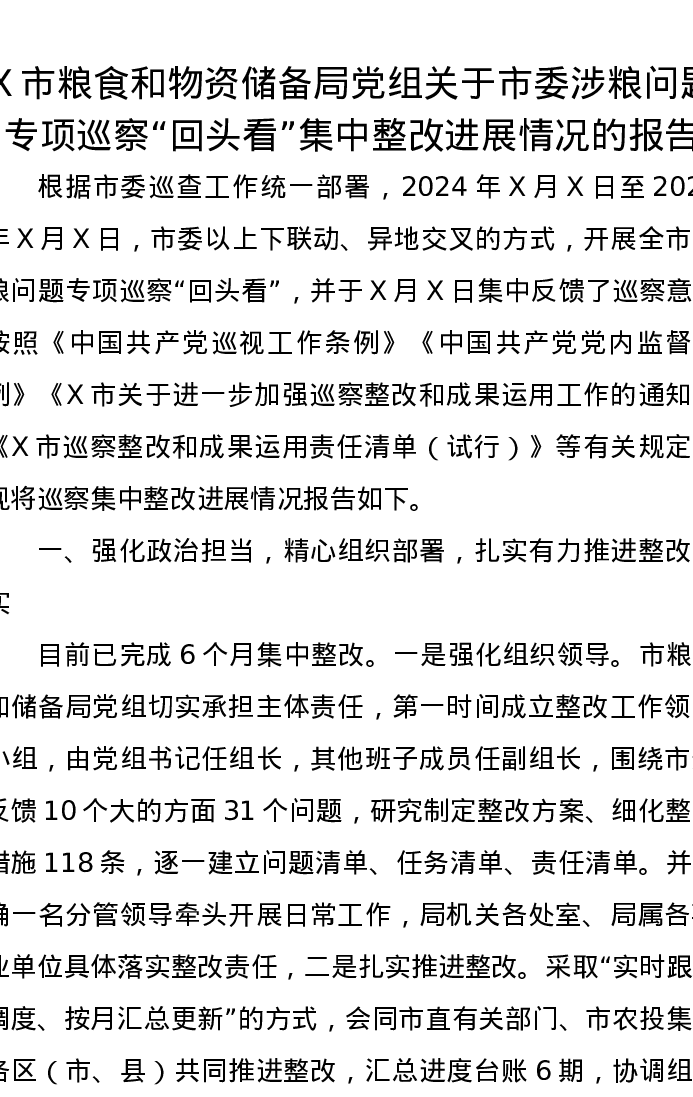 X市粮食和物资储备局党组关于市委涉粮问题专项巡察“回头看”集中整改进展情况的报告