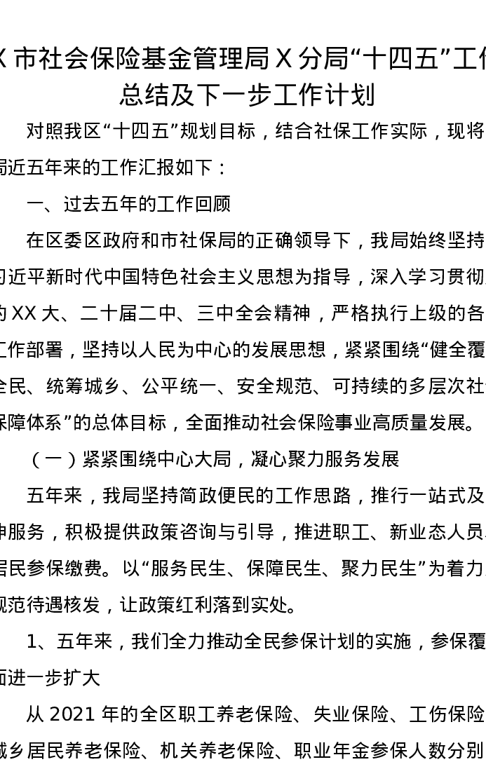 X市社会保险基金管理局X分局“十四五”工作总结及下一步工作计划