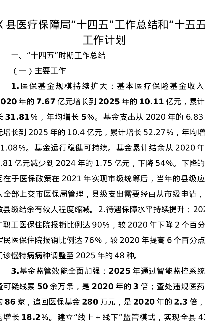 X县医疗保障局“十四五”工作总结和“十五五”工作计划