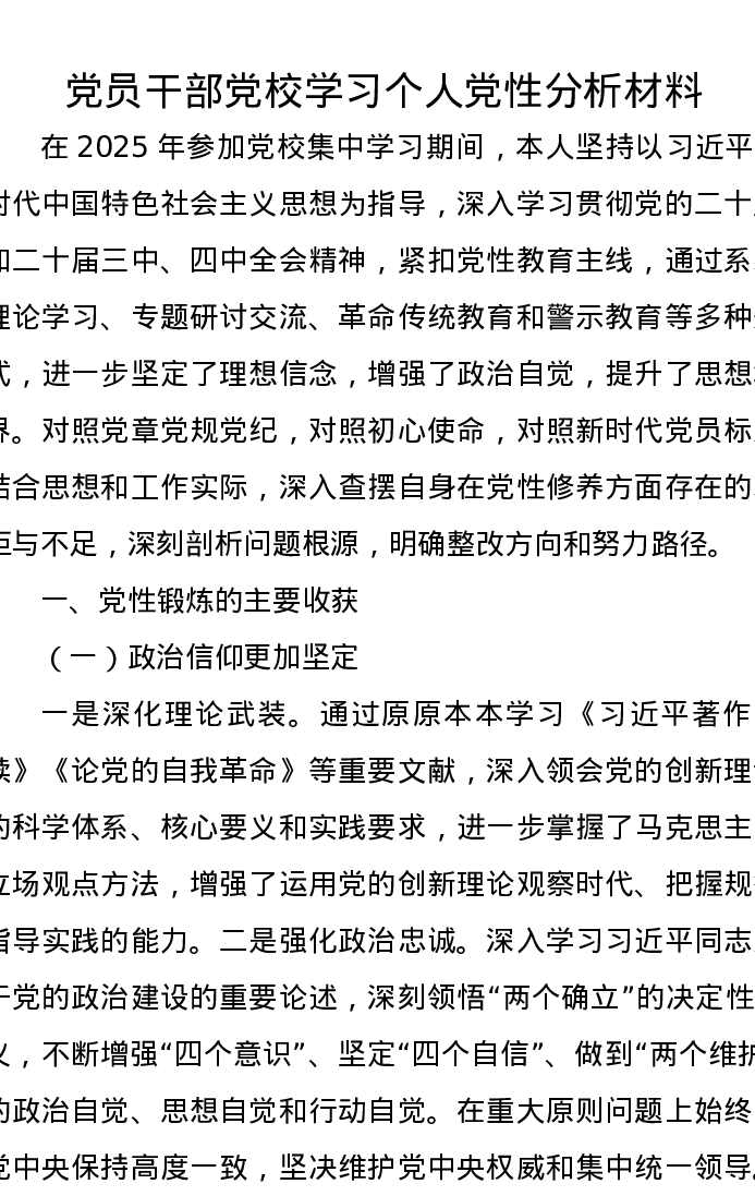 党员干部党校学习个人党性分析报告材料
