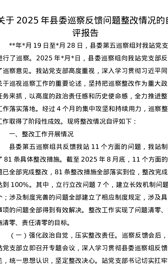 关于2025年县委巡察反馈问题整改情况的自评报告