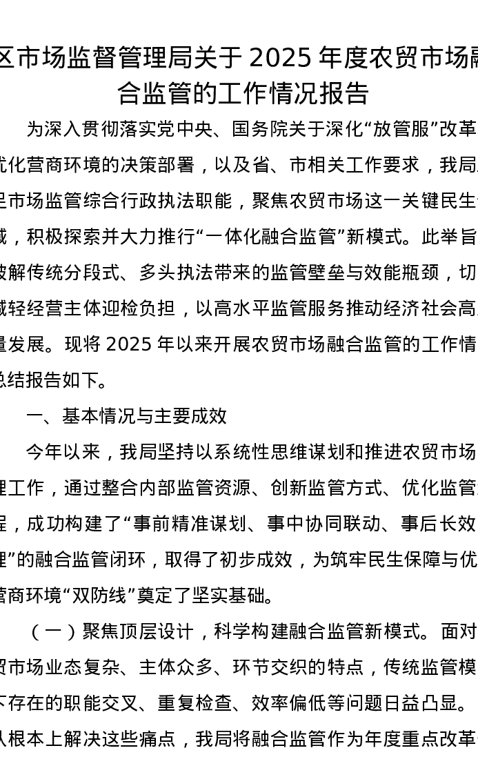 区市场监督管理局关于2025年度农贸市场融合监管的工作情况报告