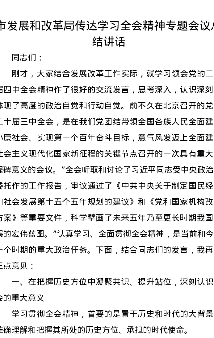 市发展和改革局传达学习二十届四中全会精神专题会议总结讲话