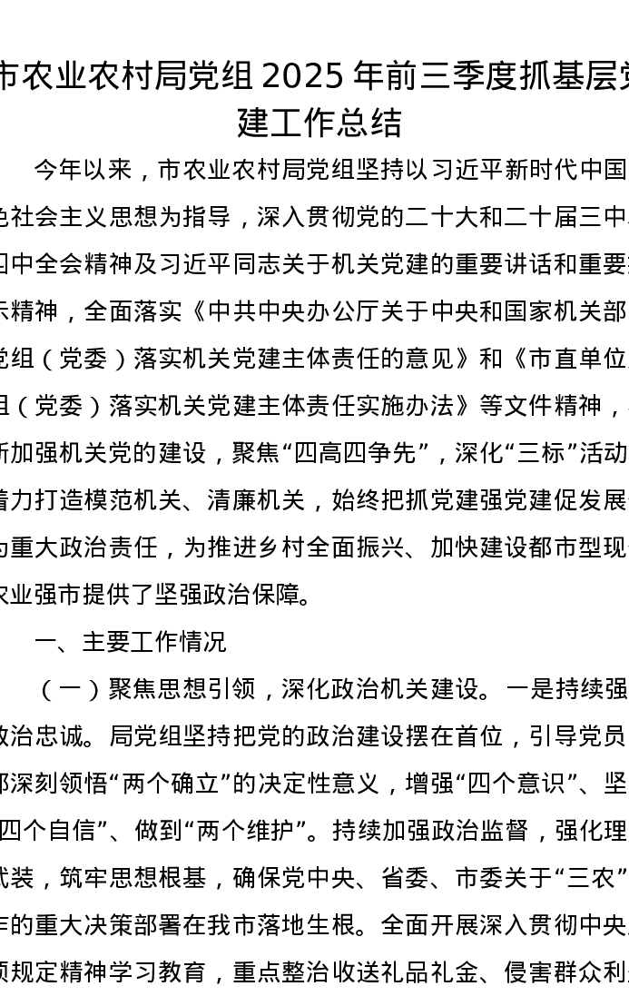 市农业农村局党组2025年前三季度抓基层党建工作总结
