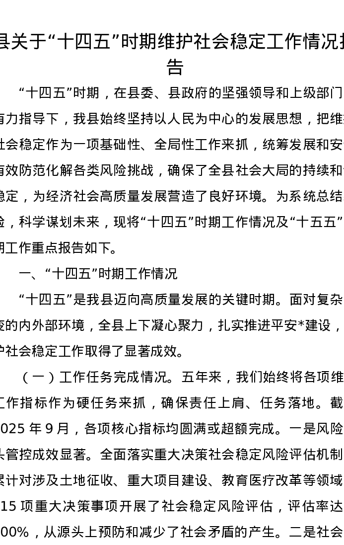 县关于“十四五”时期维护社会稳定工作情况报告