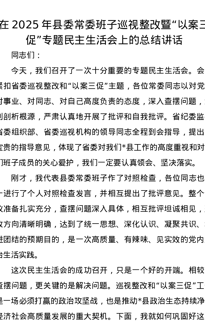 在2025年县委常委班子巡视整改暨“以案三促”专题xxxxx上的总结讲话