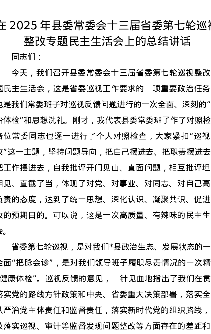 在2025年县委常委会十三届省委第七轮巡视整改专题xxxxx上的总结讲话