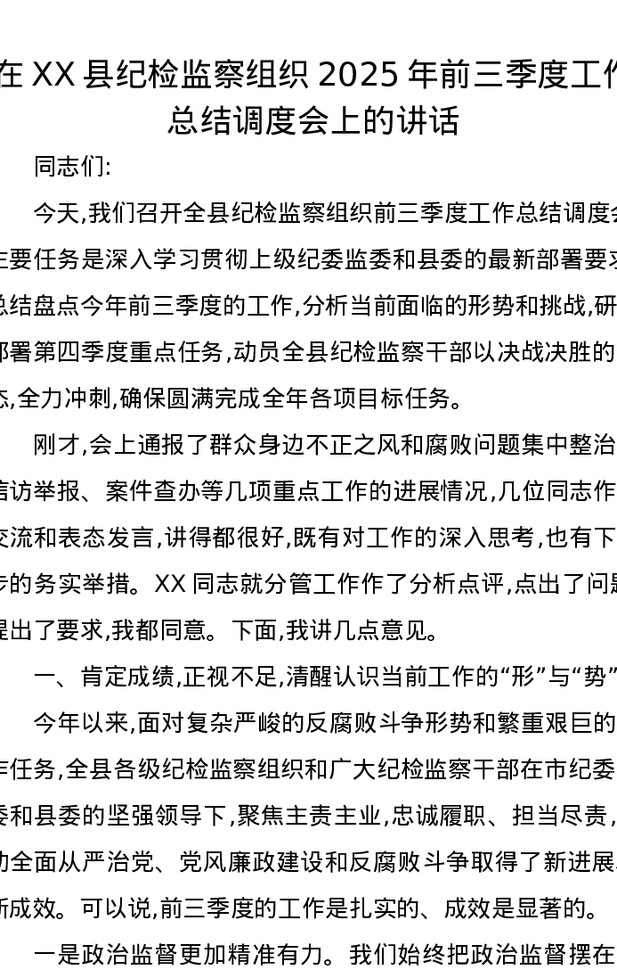 在XX县纪检监察组织2025年前三季度工作总结调度会上的讲话