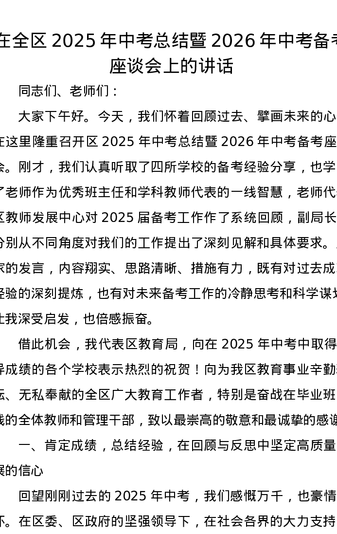 在全区2025年中考总结暨2026年中考备考座谈会上的讲话
