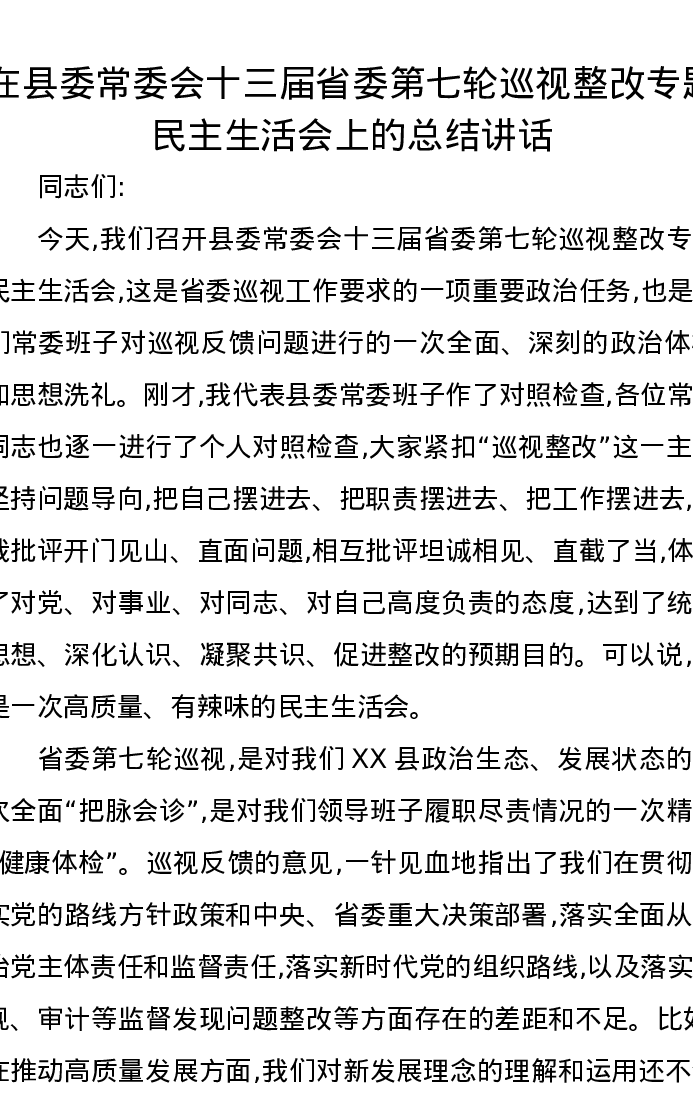 在县委常委会十三届省委第七轮巡视整改专题xxxxx上的总结讲话