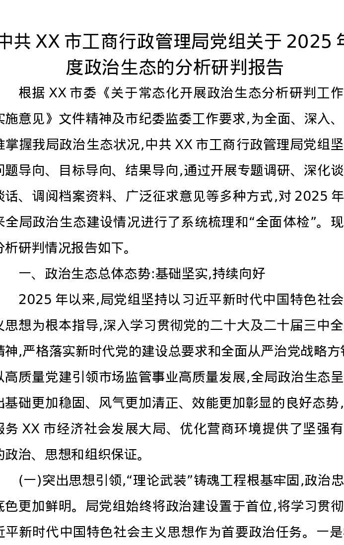 中共XX市工商行政管理局党组关于2025年度政治生态的分析研判报告