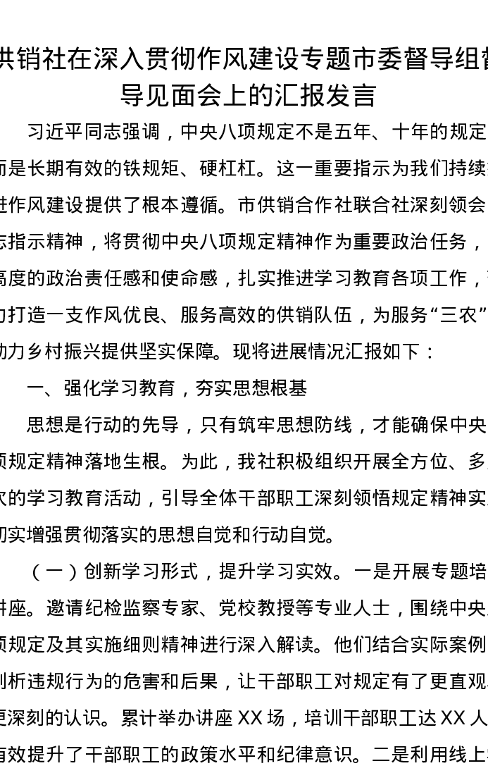 供销社在深入贯彻作风建设专题市委督导组督导见面会上的汇报发言