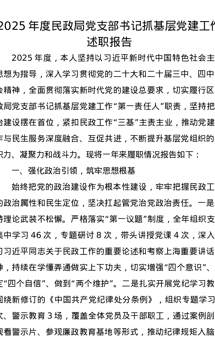 2025年度民政局党支部书记抓基层党建工作述职报告
