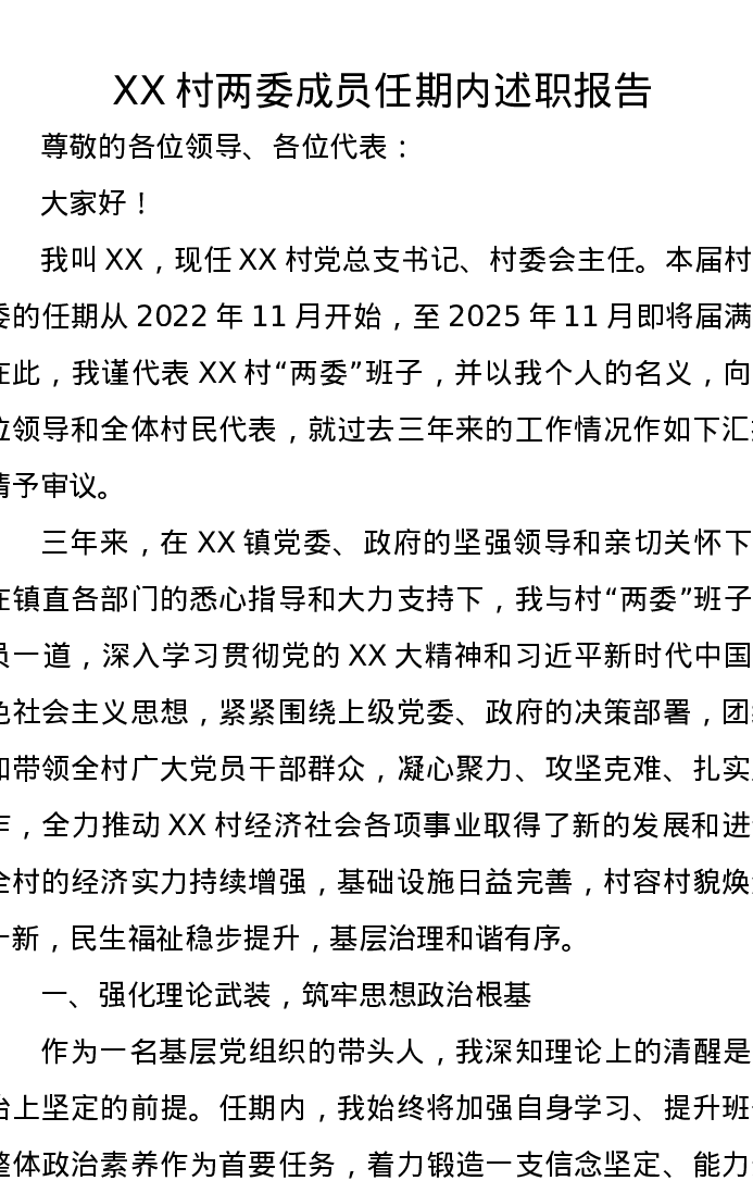 XX村两委成员任期内述职报告