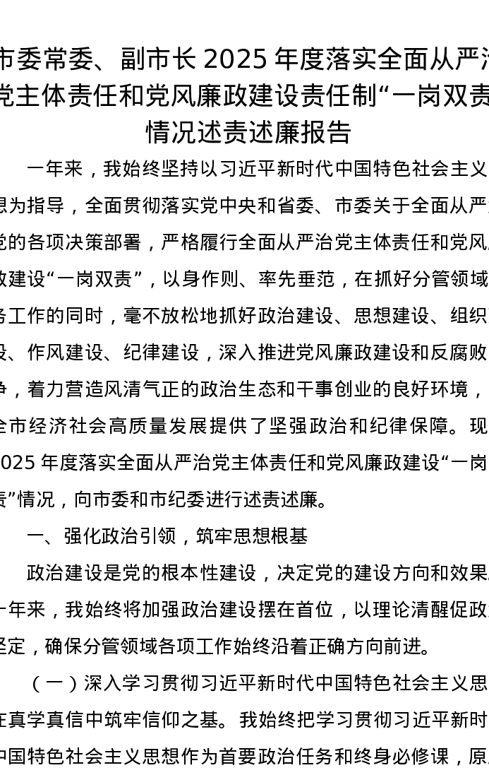 市委常委、副市长2025年度落实全面从严治党主体责任和党风廉政建设责任制“一岗双责”情况述责述廉报告