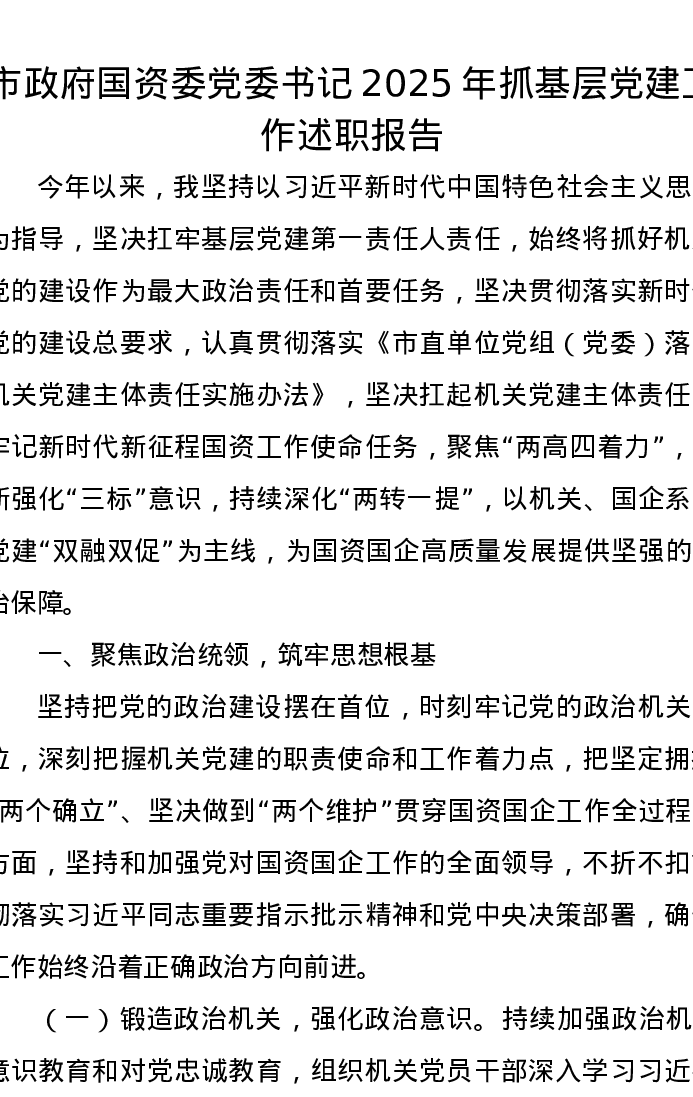 市政府国资委党委书记2025年抓基层党建工作述职报告