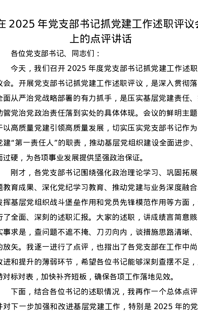 在2025年党支部书记抓党建工作述职评议会上的点评讲话