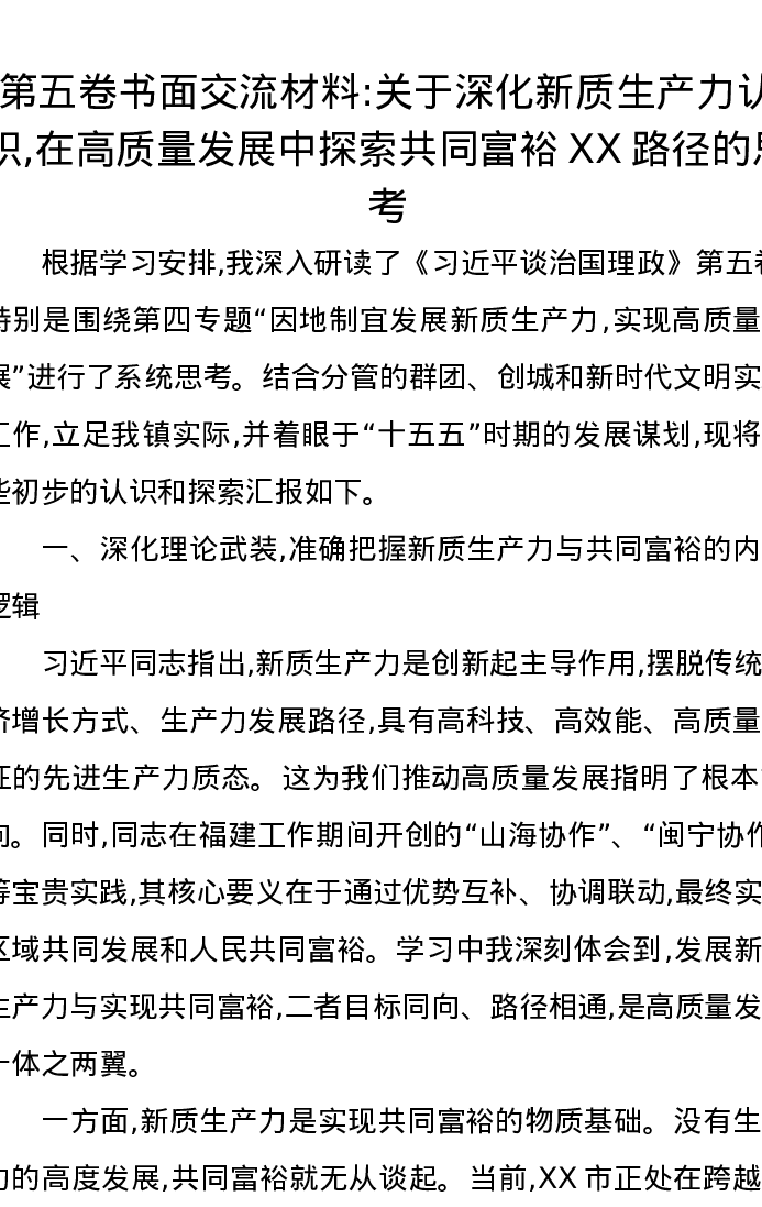《治国理政》第五卷书面交流发言材料:关于深化新质生产力认识,在高质量发展中探索共同富裕XX路径的思考