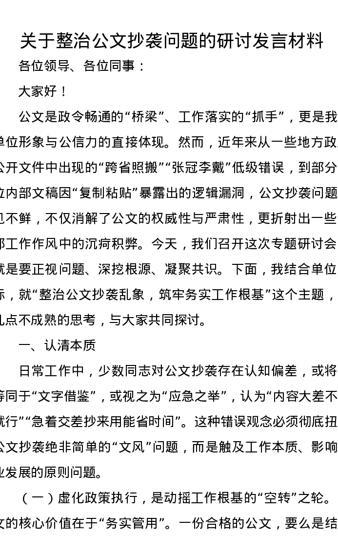 关于整治公文抄袭问题的研讨发言材料