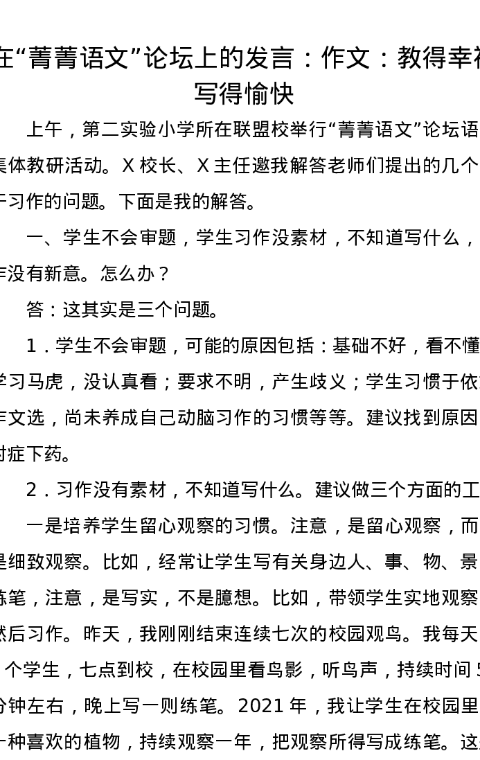 在“菁菁语文”论坛上的发言:作文:教得幸福,写得愉快
