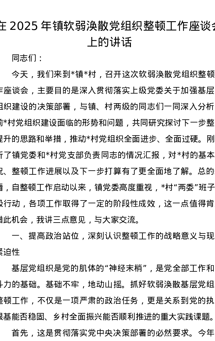 在2025年镇软弱涣散党组织整顿工作座谈会上的讲话