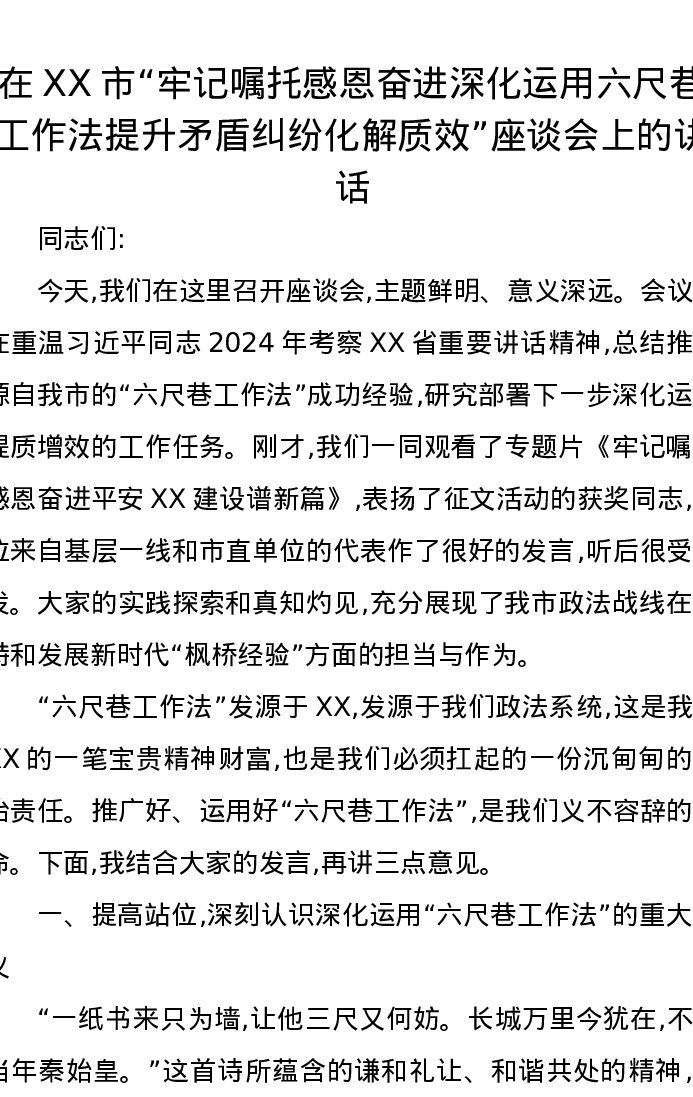 在XX市“牢记嘱托感恩奋进深化运用六尺巷工作法提升矛盾纠纷化解质效”座谈会上的讲话