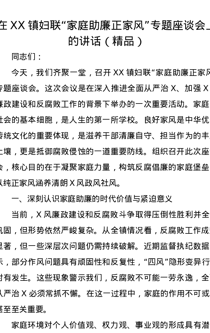 在XX镇妇联“家庭助廉正家风”专题座谈会上的讲话