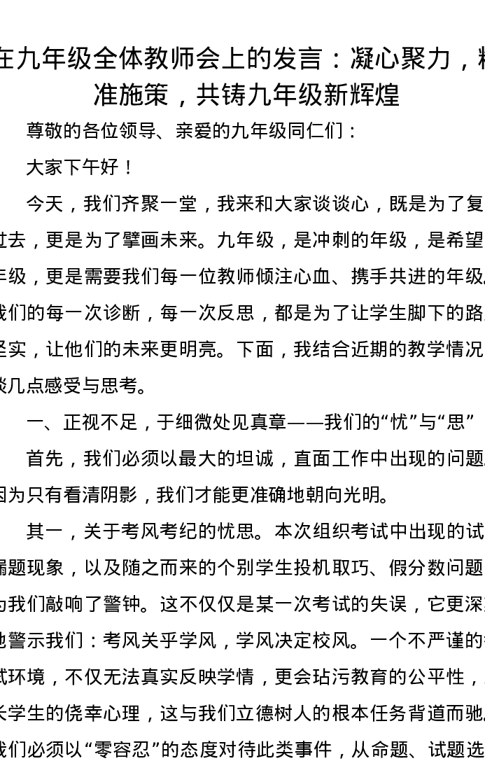 在九年级全体教师会上的发言:凝心聚力,精准施策,共铸九年级新辉煌