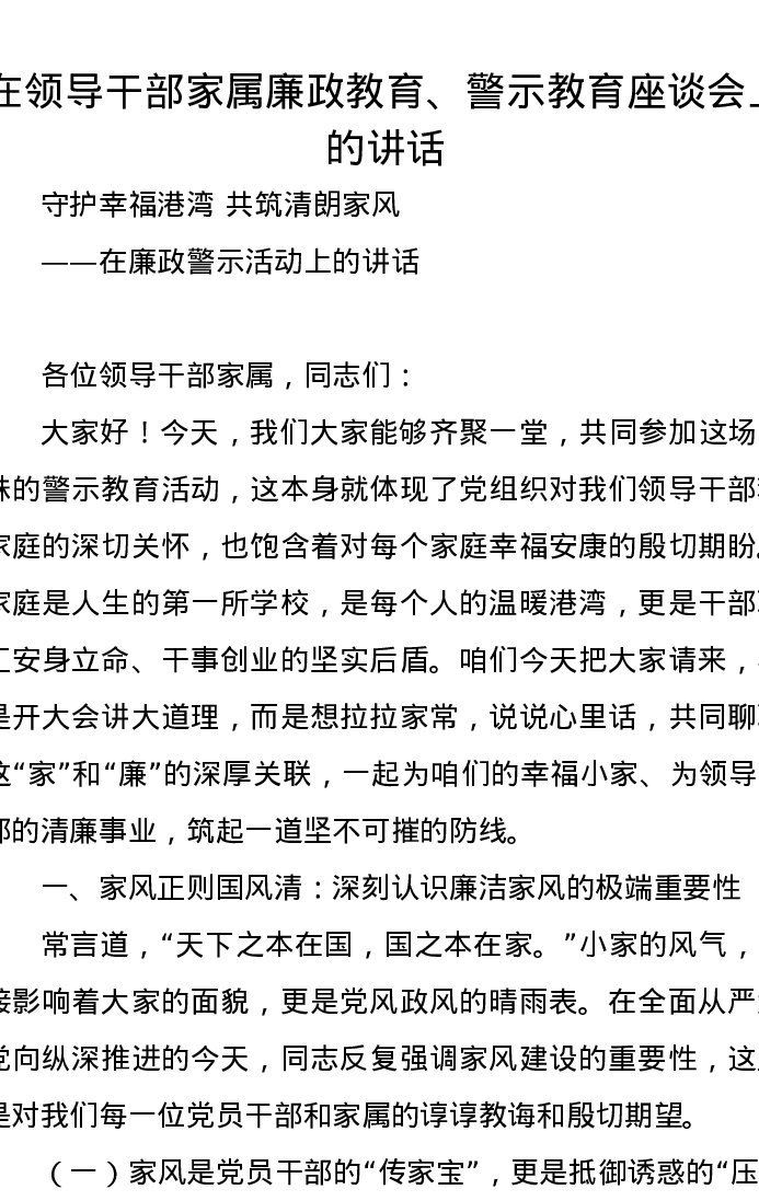 在领导干部家属廉政教育、警示教育座谈会上的讲话