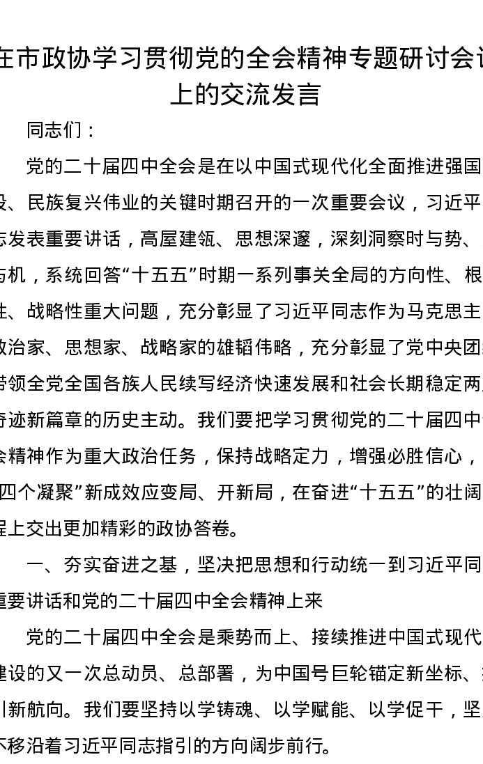 在市政协学习贯彻党的二十届四中全会精神专题研讨会议上的交流发言