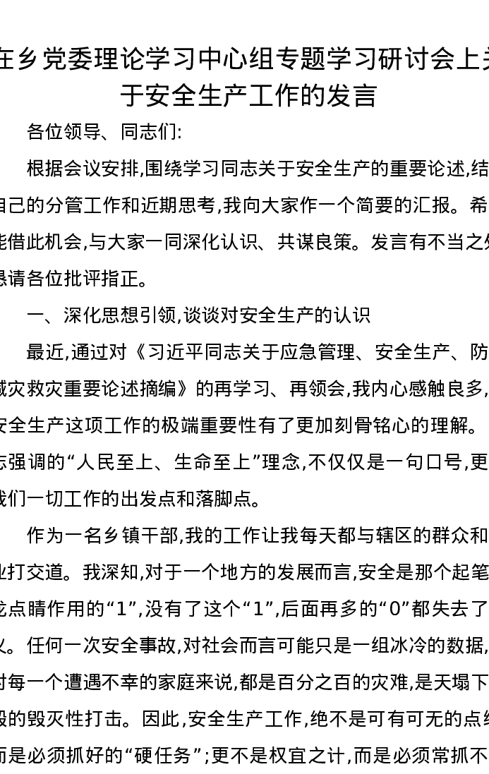 在乡党委理论学习中心组专题学习研讨会上关于安全生产工作的发言