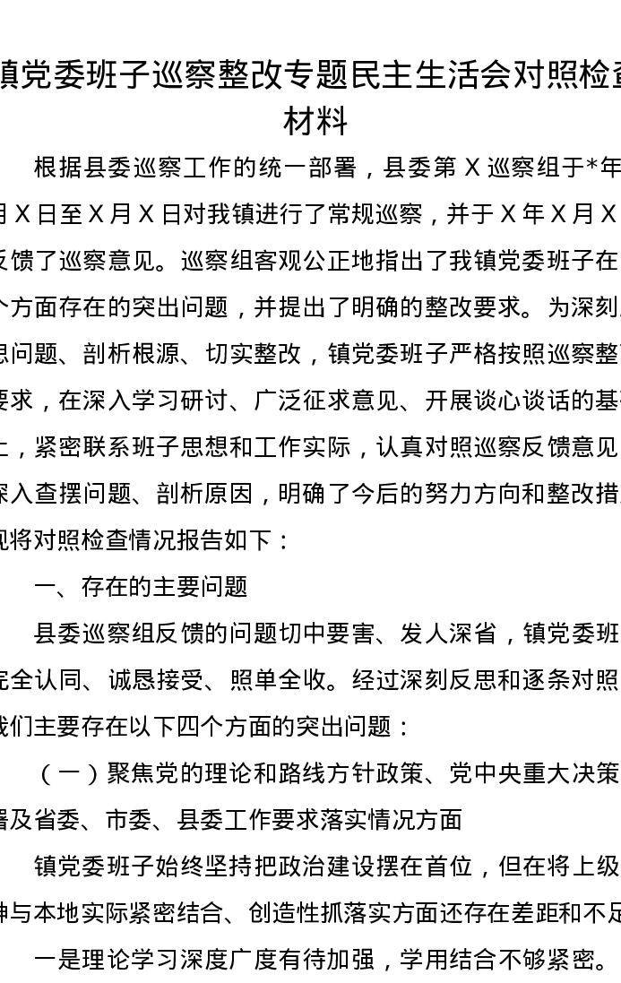 镇党委班子巡察整改专题xxxxx对照检查材料