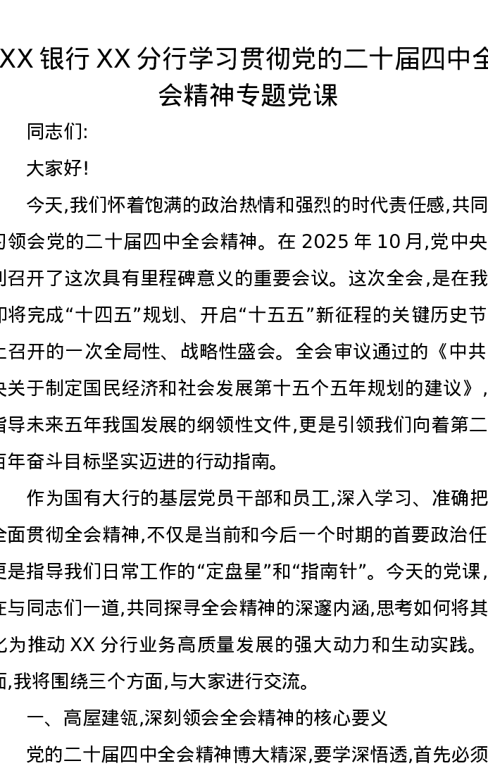 XX银行XX分行学习贯彻党的二十届四中全会精神专题党课