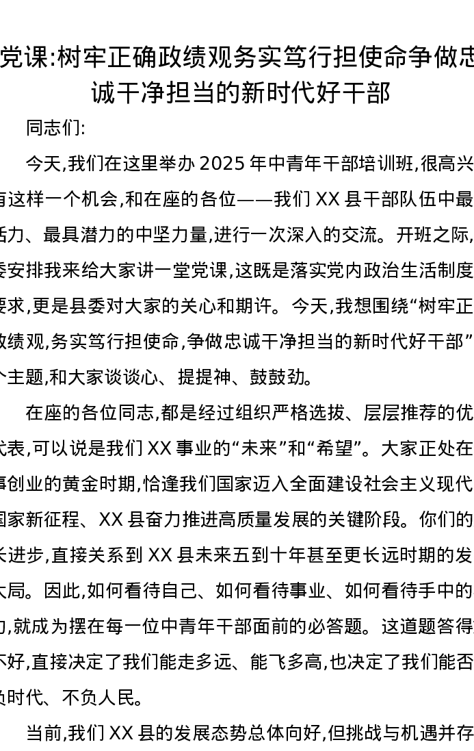 党课讲稿:树牢正确政绩观务实笃行担使命争做忠诚干净担当的新时代好干部