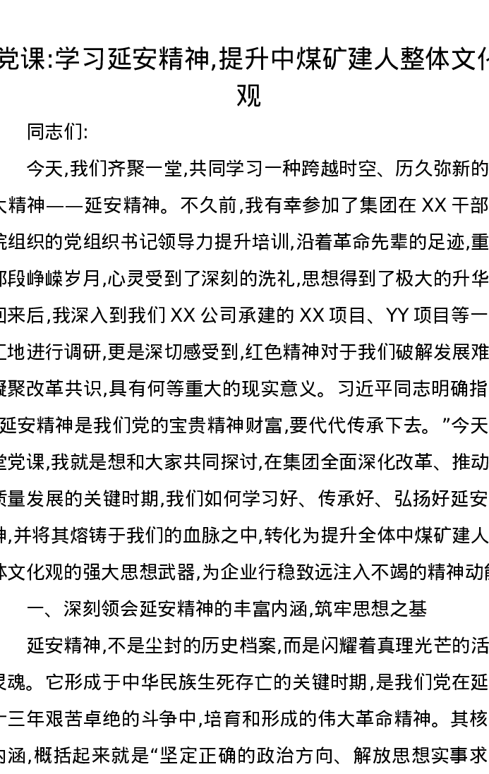 党课讲稿:学习延安精神,提升中煤矿建人整体文化观