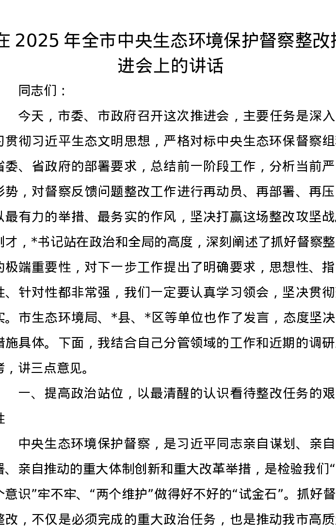 在2025年全市中央生态环境保护督察整改推进会上的讲话