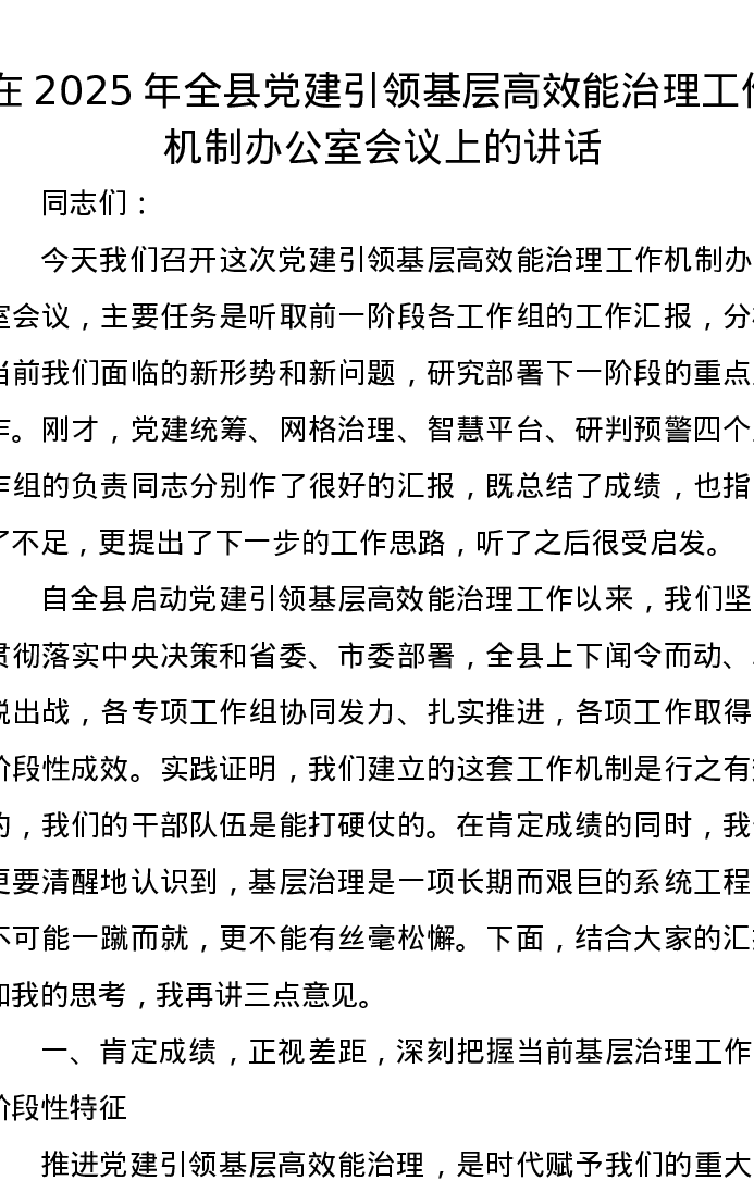 在2025年全县党建引领基层高效能治理工作机制办公室会议上的讲话