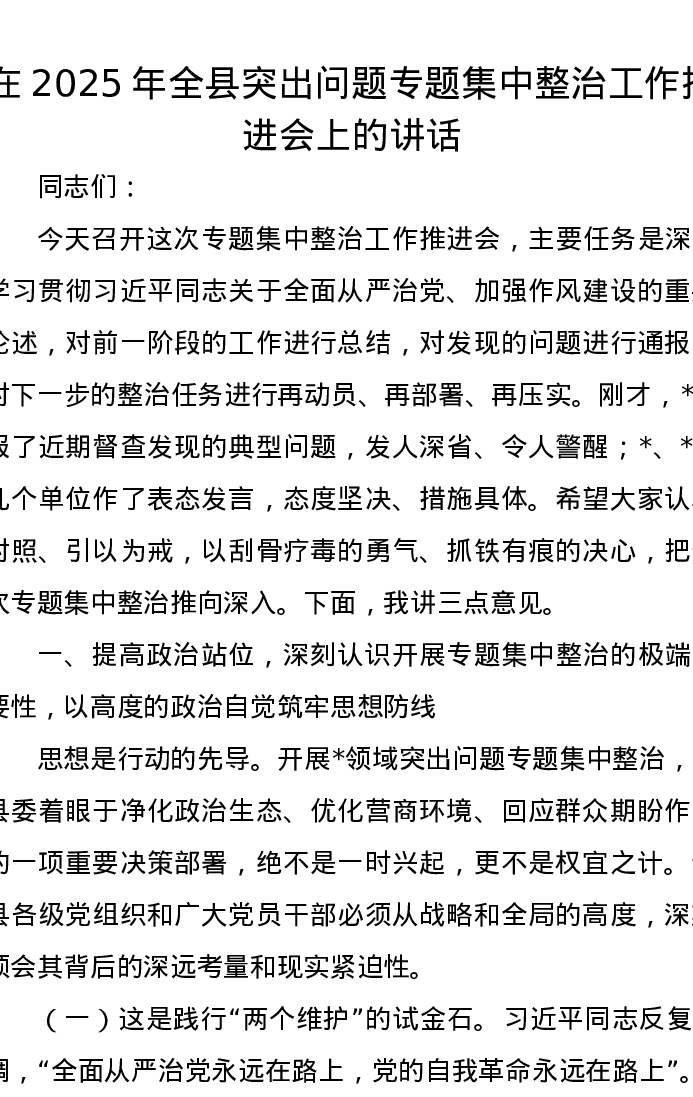 在2025年全县突出问题专题集中整治工作推进会上的讲话