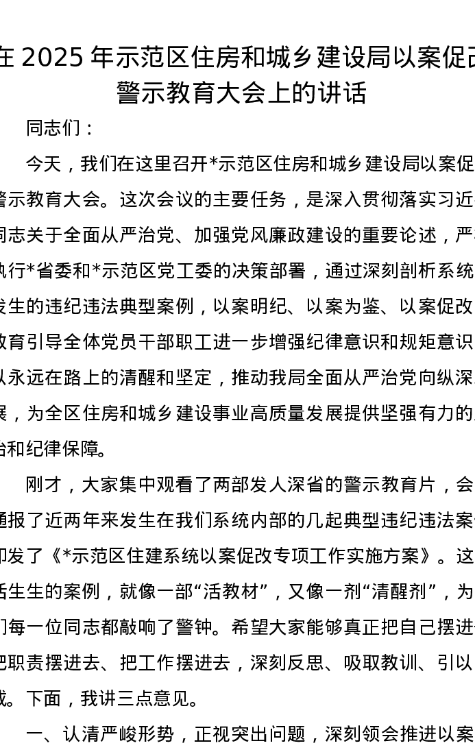 在2025年示范区住房和城乡建设局以案促改警示教育大会上的讲话