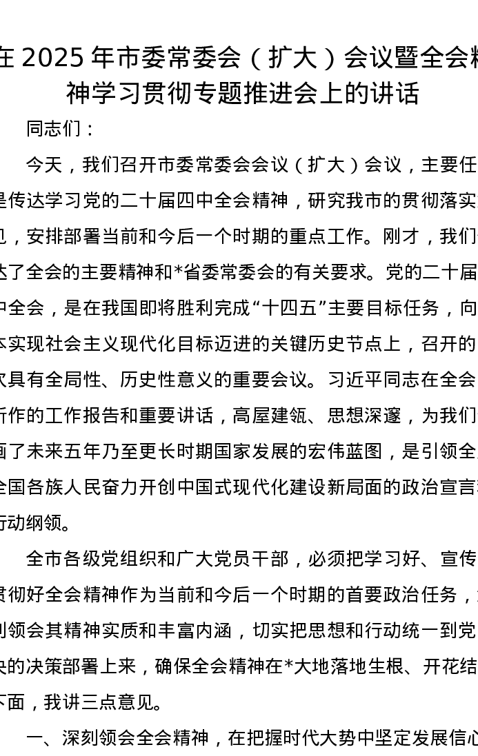 在2025年市委常委会(扩大)会议暨全会精神学习贯彻专题推进会上的讲话