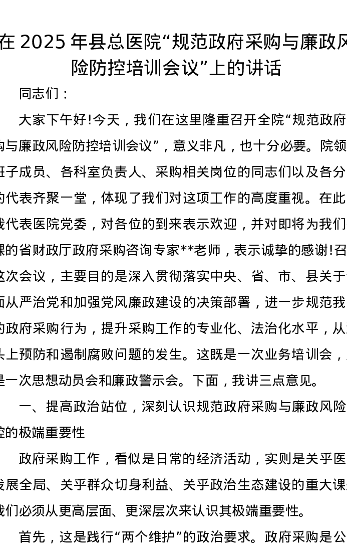 在2025年县总医院“规范政府采购与廉政风险防控培训会议”上的讲话