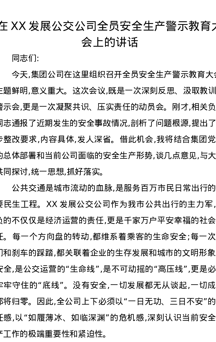 在XX发展公交公司全员安全生产警示教育大会上的讲话